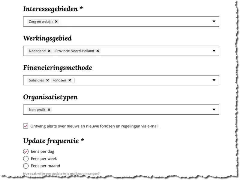Als je lid bent van Fondswervingonline adviseren we je daarom als eerste "Mijn interessegebieden" in te vullen.