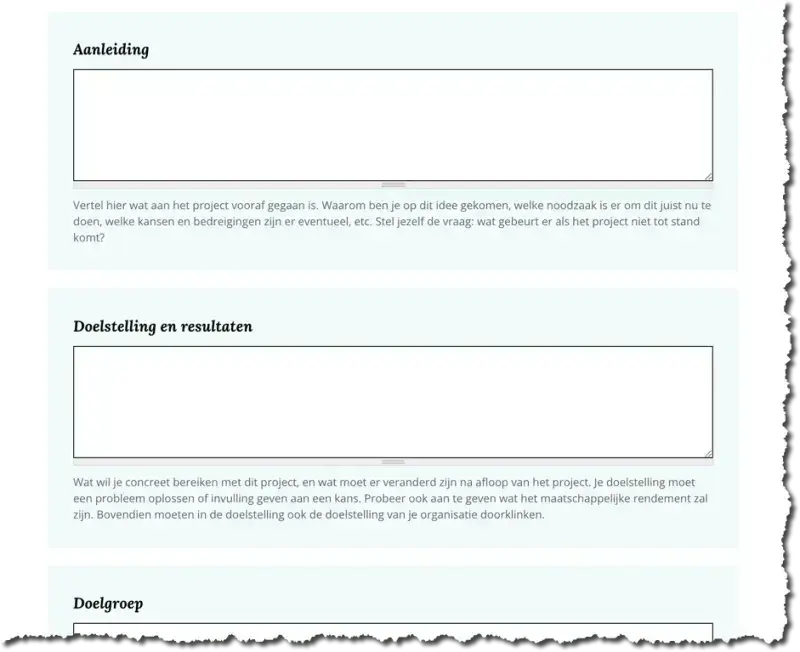 Omdat lang niet alle verstrekkers alle activiteiten subsidiëren moet je dus een selectie maken van verstrekkers die projecten ondersteunen die aansluiten bij je project. Je project moet dus als het goed is overeenkomen met de doelstelling van de verstrekker.