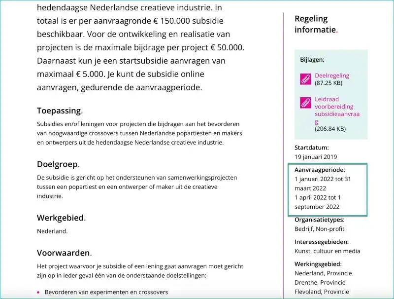 - Kijk dus goed na of de regelingen die voor jou interessant zijn een aanvraagperiode hebben